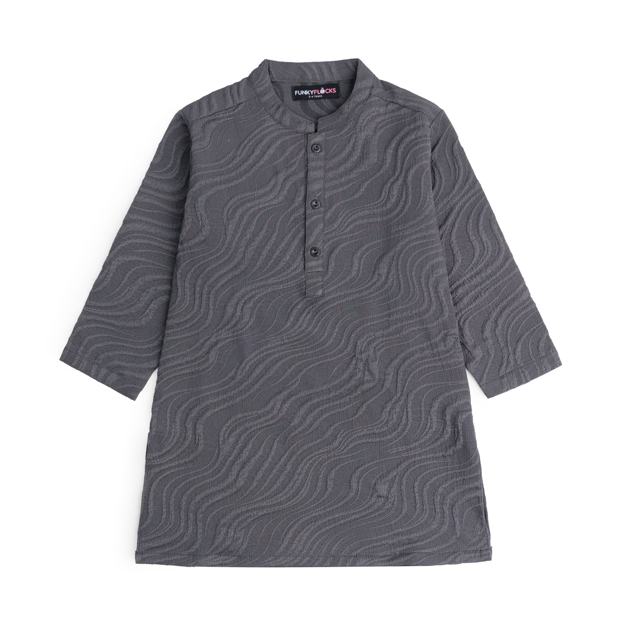Elevate your son's wardrobe with this sophisticated boys kurta featuring a refined self-texture design in deep dark grey. The textured fabric adds visual depth and dimension, creating a polished look perfect for both casual wear and special occasions. The classic kurta silhouette offers comfortable, unrestricted movement while maintaining a sharp, put-together appearance. Crafted with attention to detail, this versatile piece pairs effortlessly with traditional or contemporary styling. An essential addition for any young man's collection seeking understated elegance and timeless appeal.