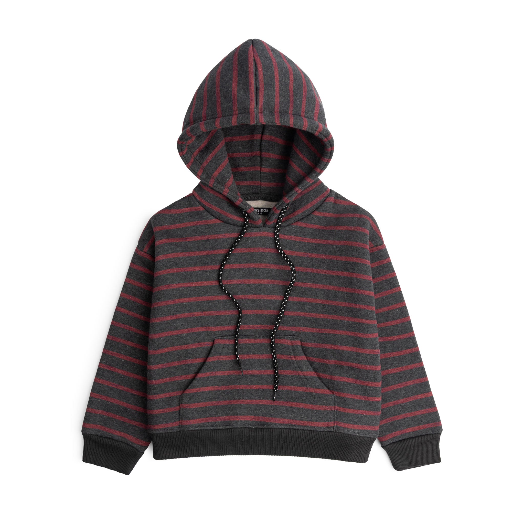 This boys' striped pullover hoodie combines charcoal grey and red hues for a modern, stylish look. Designed for comfort and warmth, its soft fabric is perfect for active days or layering during cooler weather. The pullover design ensures easy wear, while the eye-catching stripes add a sporty touch. Ideal for everyday use, this hoodie offers both practicality and a trendy edge.
