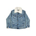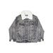 This is a stylish black-washed denim jacket featuring a white faux shearling collar. It has a button-up front closure, two chest pockets with buttoned flaps, and two side pockets. The jacket also features buttoned cuffs and a slightly faded, vintage-style look. It is designed to provide warmth while maintaining a trendy, rugged appearance. Perfect for casual and winter wear.