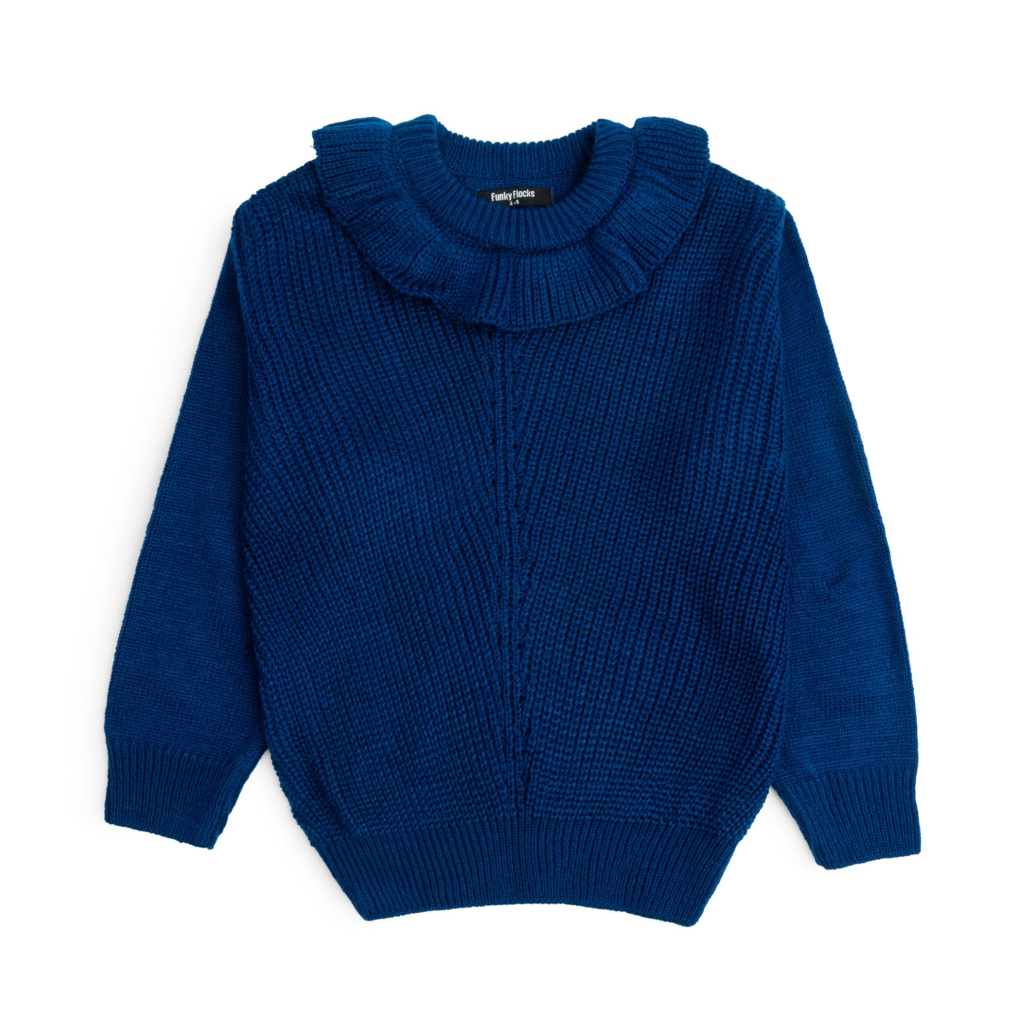 This Girls Knit Sweater features a delicate ruffle neck design in a rich royal blue shade, offering both style and warmth. Crafted from soft knit fabric, it ensures comfort for everyday wear while adding a refined touch to any outfit. Ideal for layering during cooler days, it combines practicality with elegant detailing for young wardrobes.