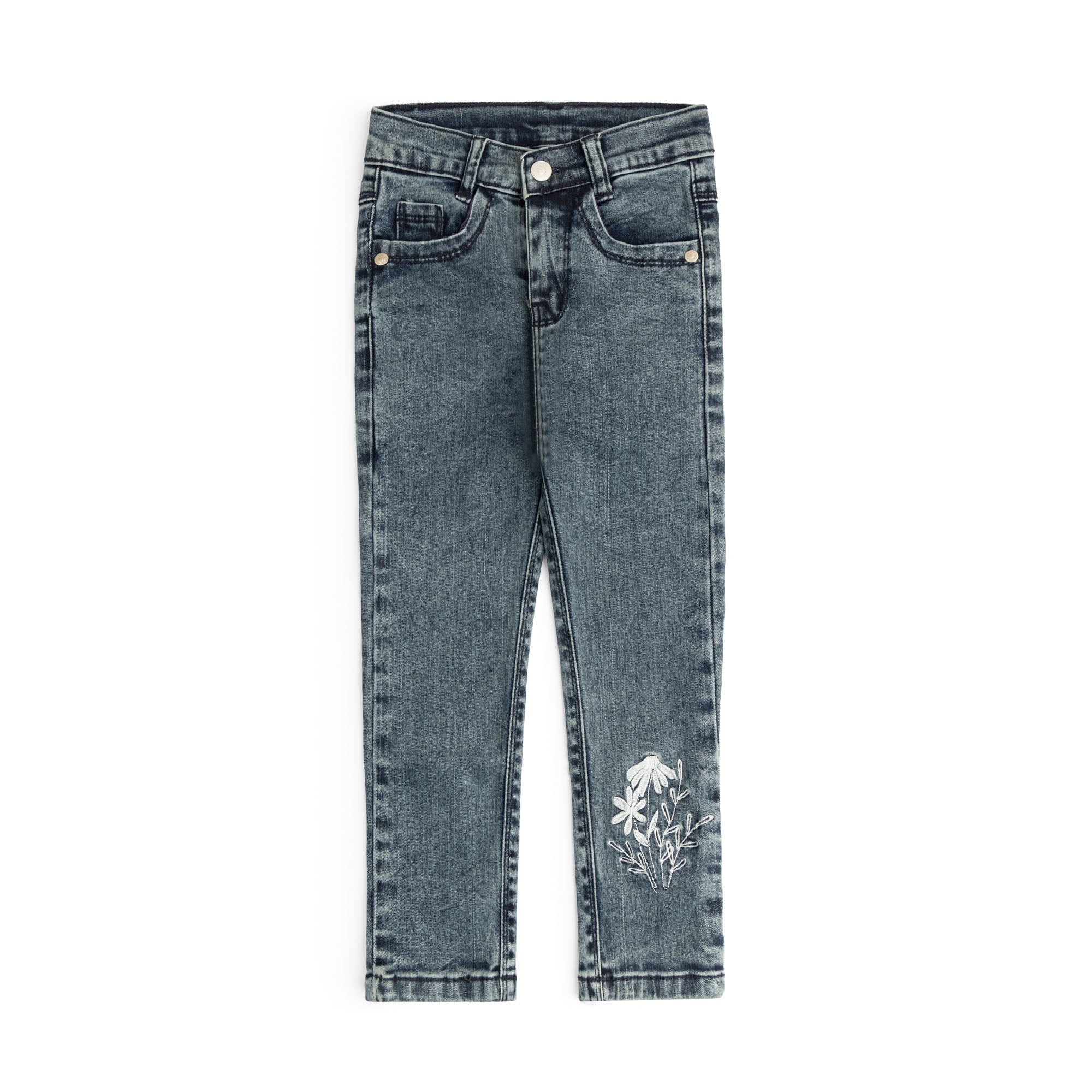 These embroidered girls' jeans in a stylish greyish blue shade combine durability with delicate detailing. Crafted for comfort and long-lasting wear, they offer a perfect fit that supports active movement while adding a touch of elegance through intricate embroidery. Ideal for everyday use or special occasions, these jeans balance practicality with refined design.