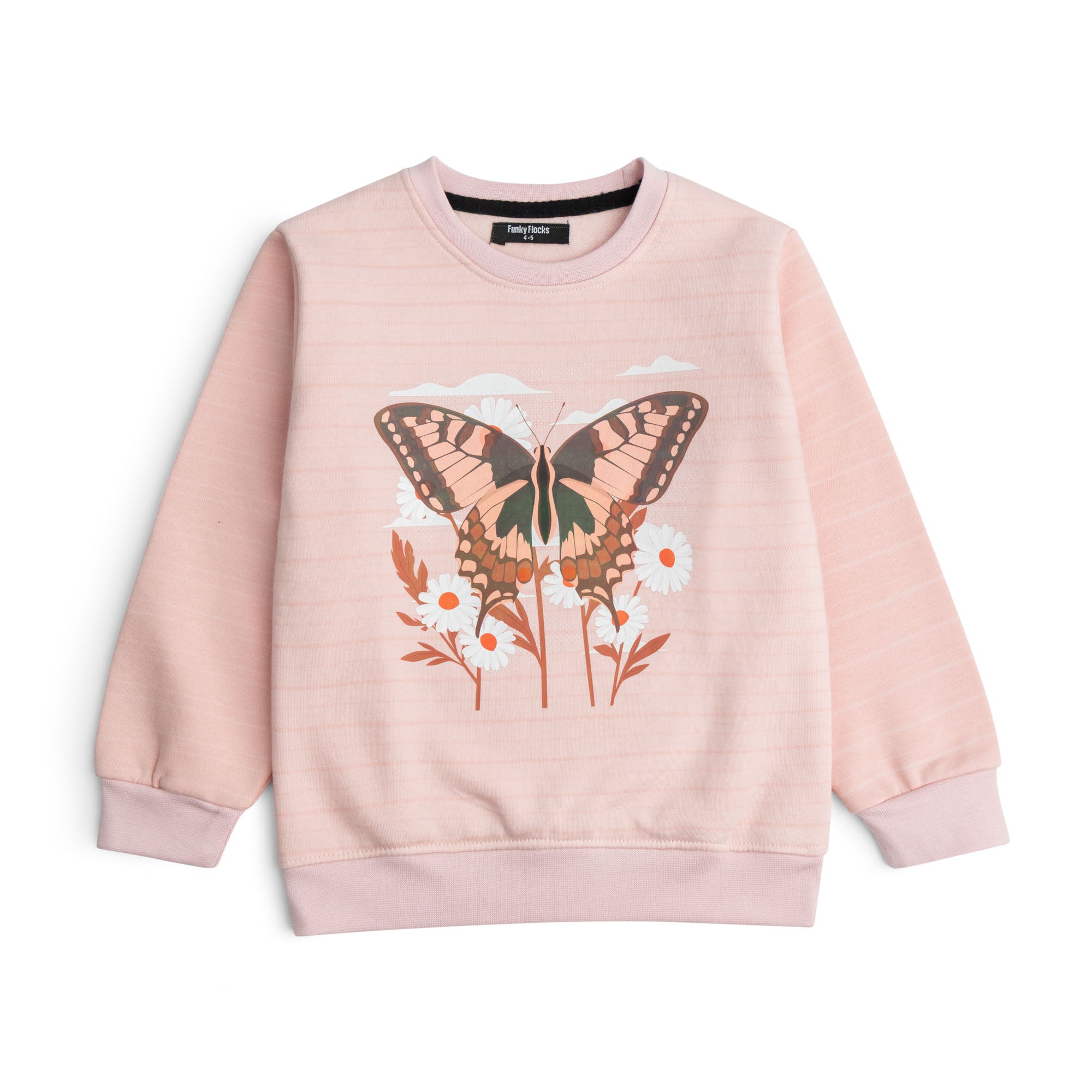 This light pink sweatshirt combines comfort with a delicate aesthetic featuring butterfly and daisy motifs. Crafted for a soft feel and relaxed fit, it offers both warmth and style, making it an ideal choice for casual wear with a subtle, nature-inspired touch.