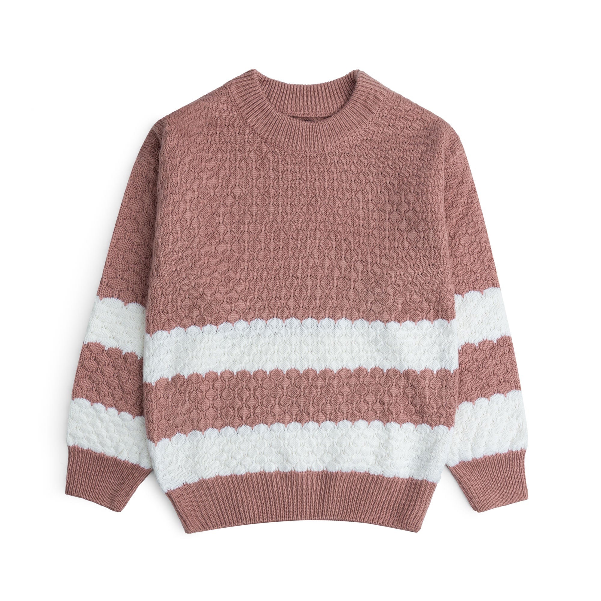 This Dusty Rose textured knit sweater features elegant white stripes that add subtle contrast and depth to its design. Crafted for comfort and style, its soft knit fabric provides warmth without bulk, making it ideal for layering or standalone wear. The textured pattern enhances visual interest while maintaining a refined look suitable for both casual and polished outfits.